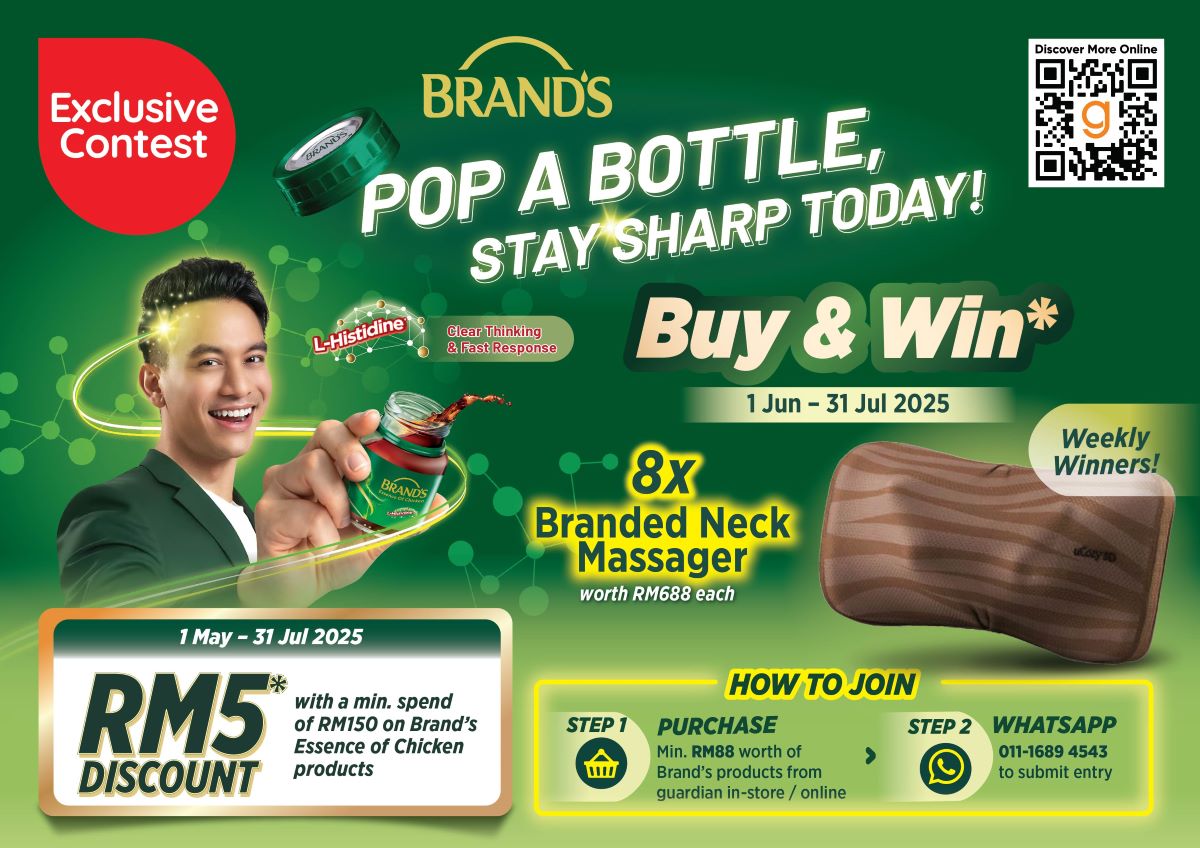 - Participants are eligible to participate in this Campaign with any purchase of BRAND’S® products worth RM88 and above from any Guardian physical store or Guardian online store during this Campaign Period ("Proof of Purchase''). The original (printed) receipt indicating the date of purchase from 1st June 2025 to 31st July 2025 must be kept by the Participant for verification purposes (if necessary) and as Proof of Purchase. For purchase via online store, screenshot the order details (must show “Delivered” status) and / or Invoice (from email) with successful transaction made as a valid Proof of Purchase.